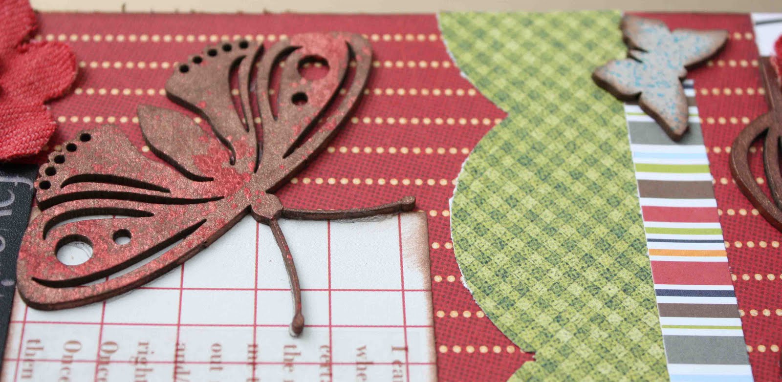 I was still able to keep this layout masculine although I added a flower. I simply took out the yellow layers (the flower was yellow and brown), scrunched it up for dimension, and added a chipboard button tied with jute to the center.